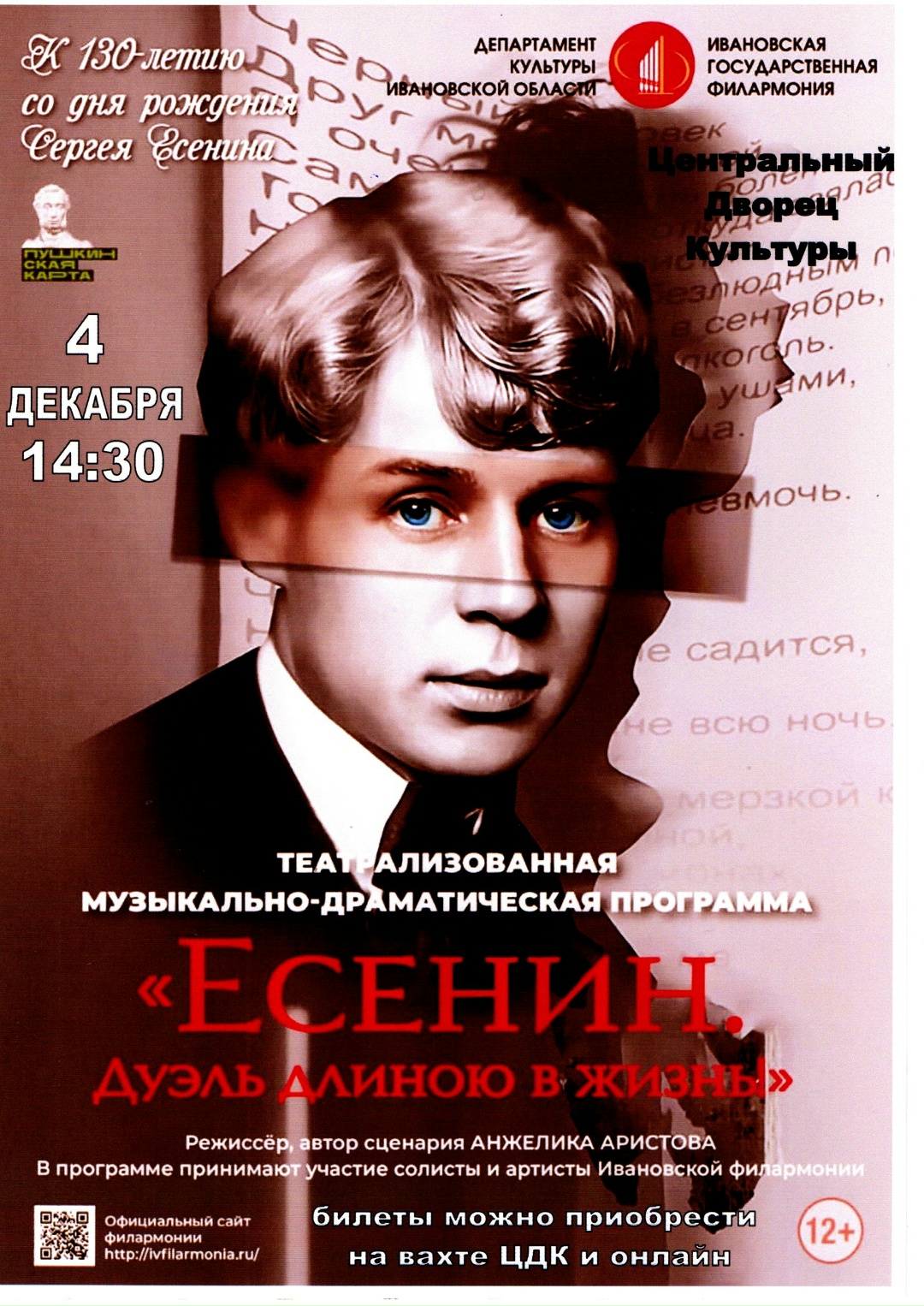 Новости Учреждения культуры 27.11.202527.11.2025 Центральный Дворец Культуры приглашает на новую театрализованную музыкально-драматическую программу «Есенин. Дуэль длинною в жизнь!», посвященную 130-летию со дня рождения русского поэта. Опубликовано: Мария Анатольевна Аронец 0 комментариев