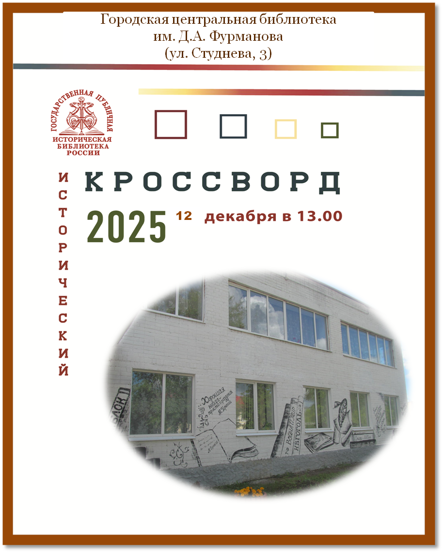 12 декабря в 13.00 Городская центральная библиотека станет площадкой для проведения «Исторического кроссворда» организатором которого стала Государственная публичная историческая библиотека России. Приглашаем всех желающих проверить свои знания в истории нашей Родины.