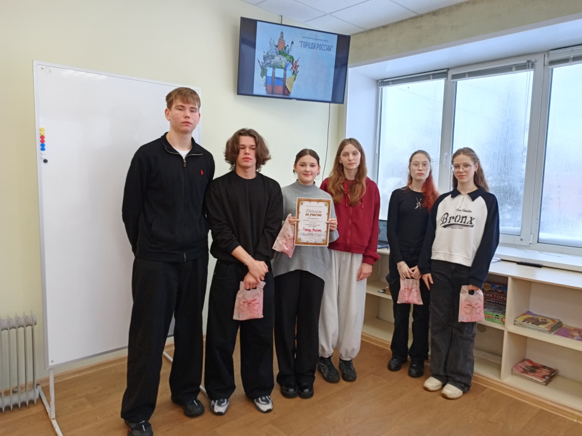 29 января в рамках программы «Пушкинская карта» в Городской центральной библиотеке состоялась интеллектуальная викторина «Города России», посвященная Году единства народов России. Викторина была построена в формате командного соревнования с последовательным выполнением заданий о городах России, достопримечательностях, культурном наследии и географии. Соревновались команды школ № 3 и № 8. Все участники показали хороший уровень подготовки и заинтересованность. Кульминацией викторины стал гастрономический конкурс «Вкусы России», на котором за общим столом, символизирующим единство и гостеприимство, обе команды окунулись в мир традиционных русских сладостей.