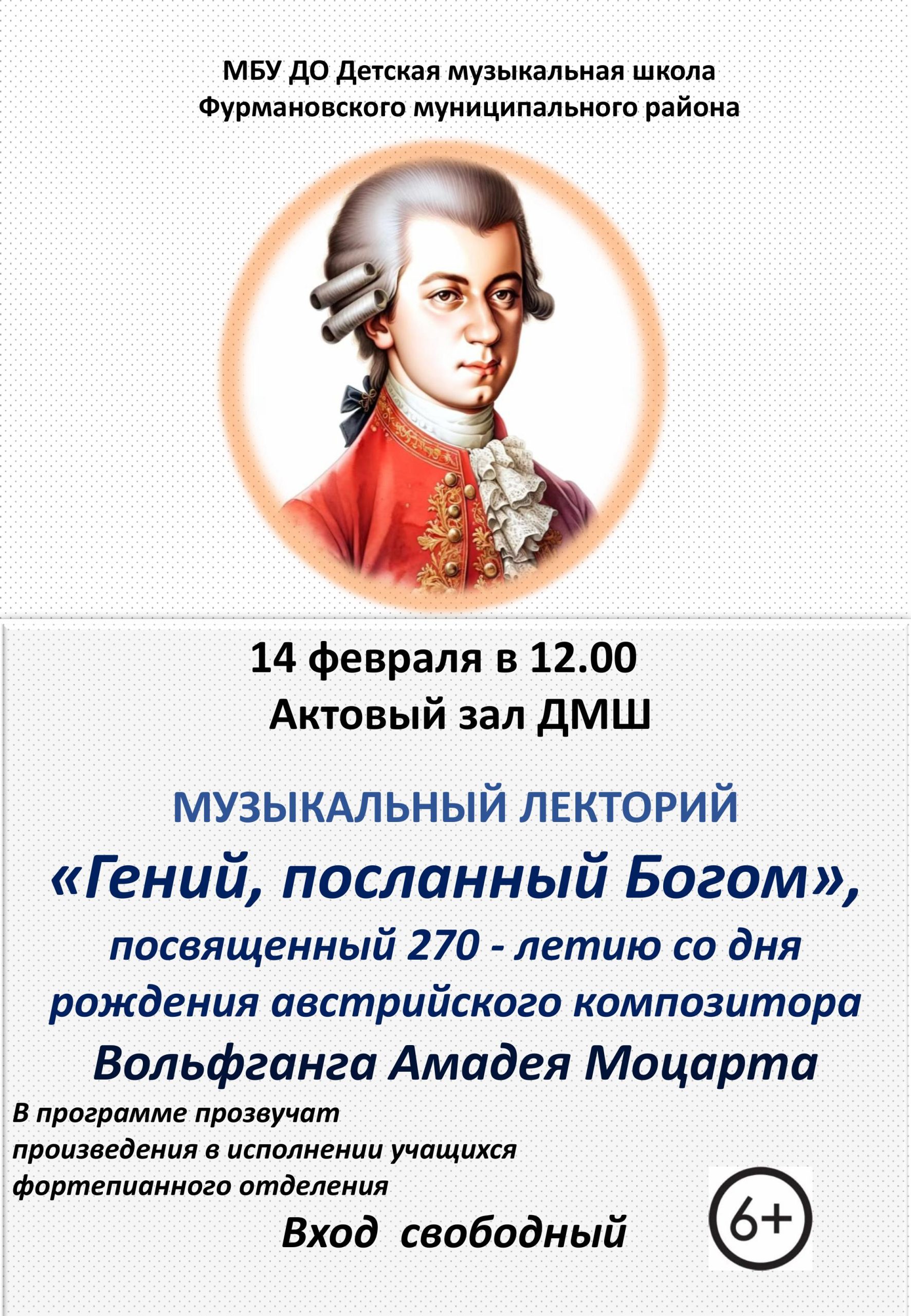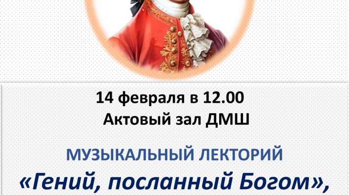 Афиша Новости 11.02.2026 В год 270-летия Вольфганга Амадея Моцарта в Детской музыкальной школе состоится мероприятие, посвящённое жизни и творчеству выдающегося австрийского композитора. Опубликовано: Мария Анатольевна Аронец 0 комментариев